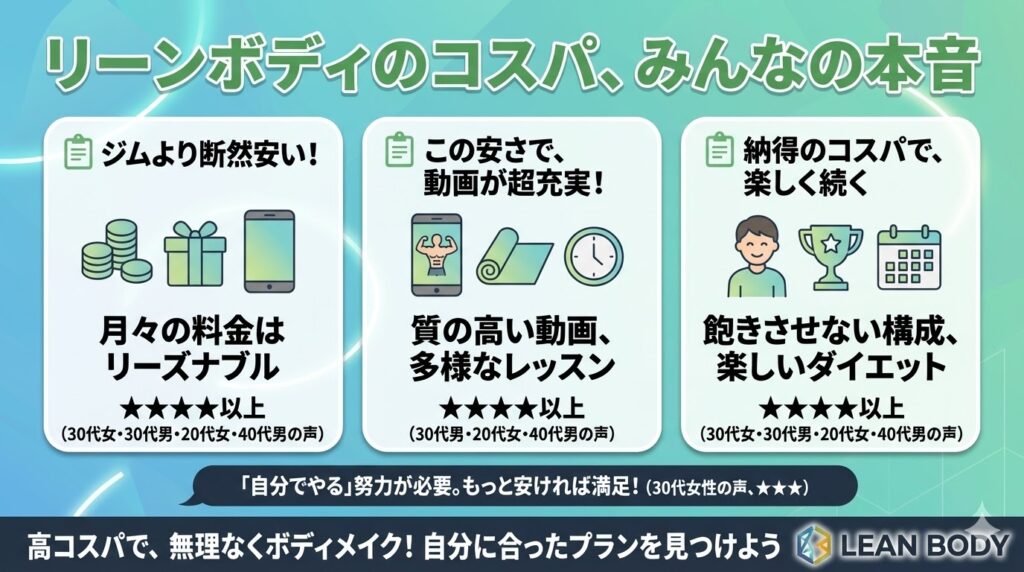 フィードバックやサポートが欲しい人、モチベーションになる人にとっては、リーンボディはYouTubeと比べて優れた選択肢といえるでしょう。