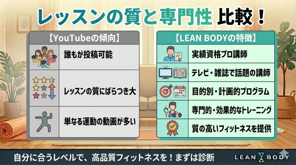 リーンボディとYouTubeとの主な違いについて、以下の5つを詳しく解説します。